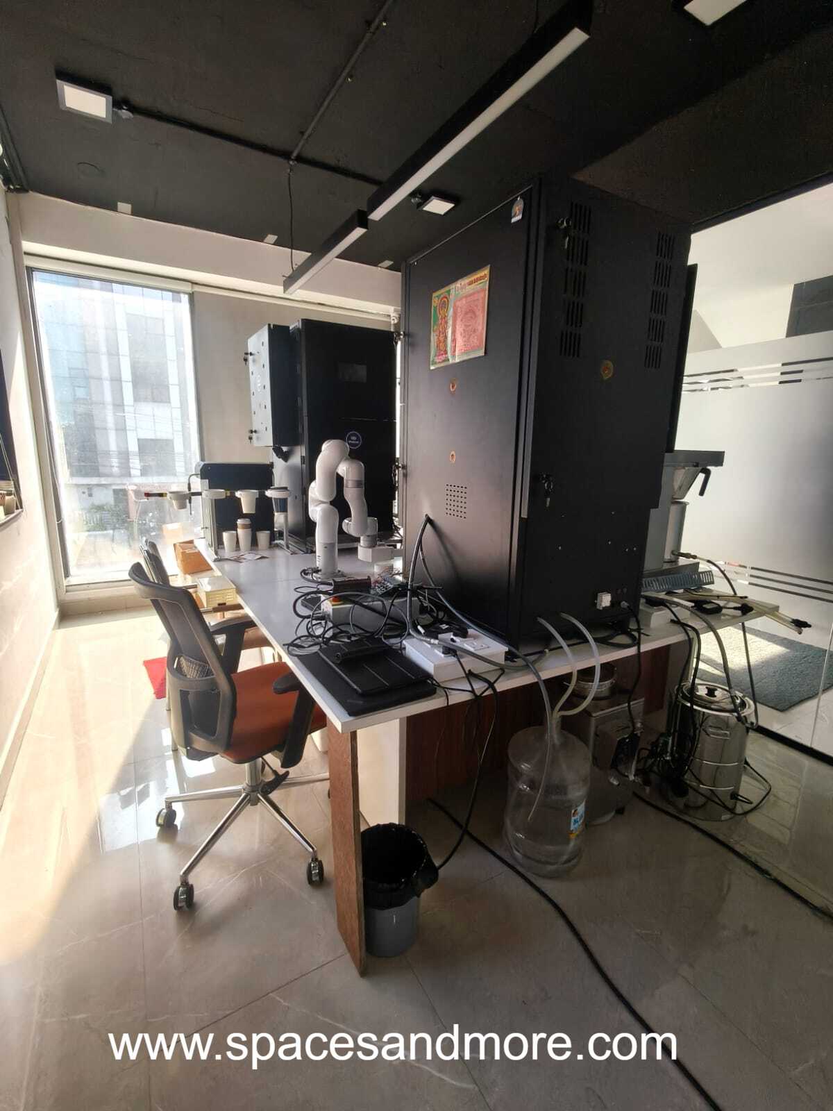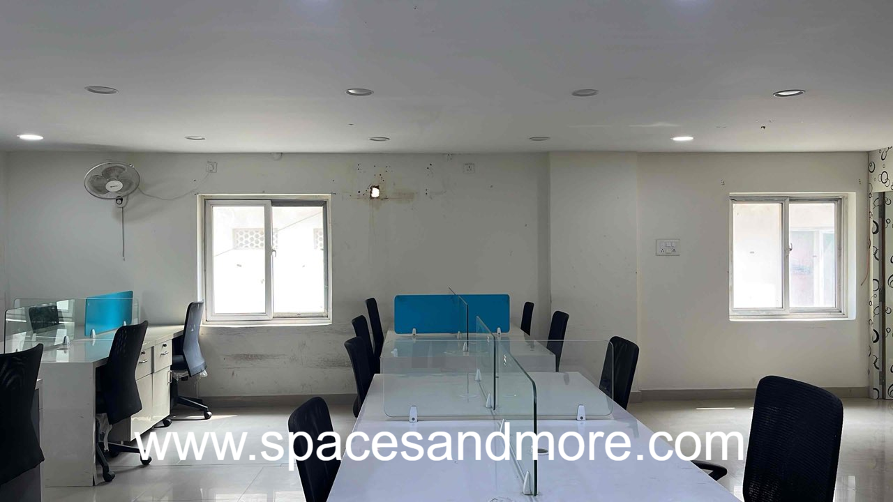Plag and play office space having 14 Work stations, 1 cabin, 1 Conference room, 1 Car parking,AC split, Reception, Pantry, Lunch room, Server Room, Onsite manager, 100 percent DG Backup..